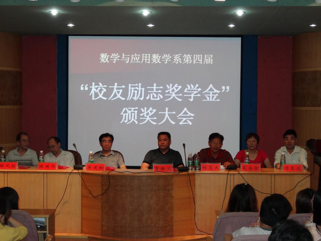 2012年5月22日下午在太阳成官网养根楼报告厅召开数学系第四届校友励志奖学金颁奖大会。出席本次大会的嘉宾有毕业于数学系的曹翰文总经理、副校长蒋建初、校友办夏主任、学工处鄢副处长及我系四位领导等。