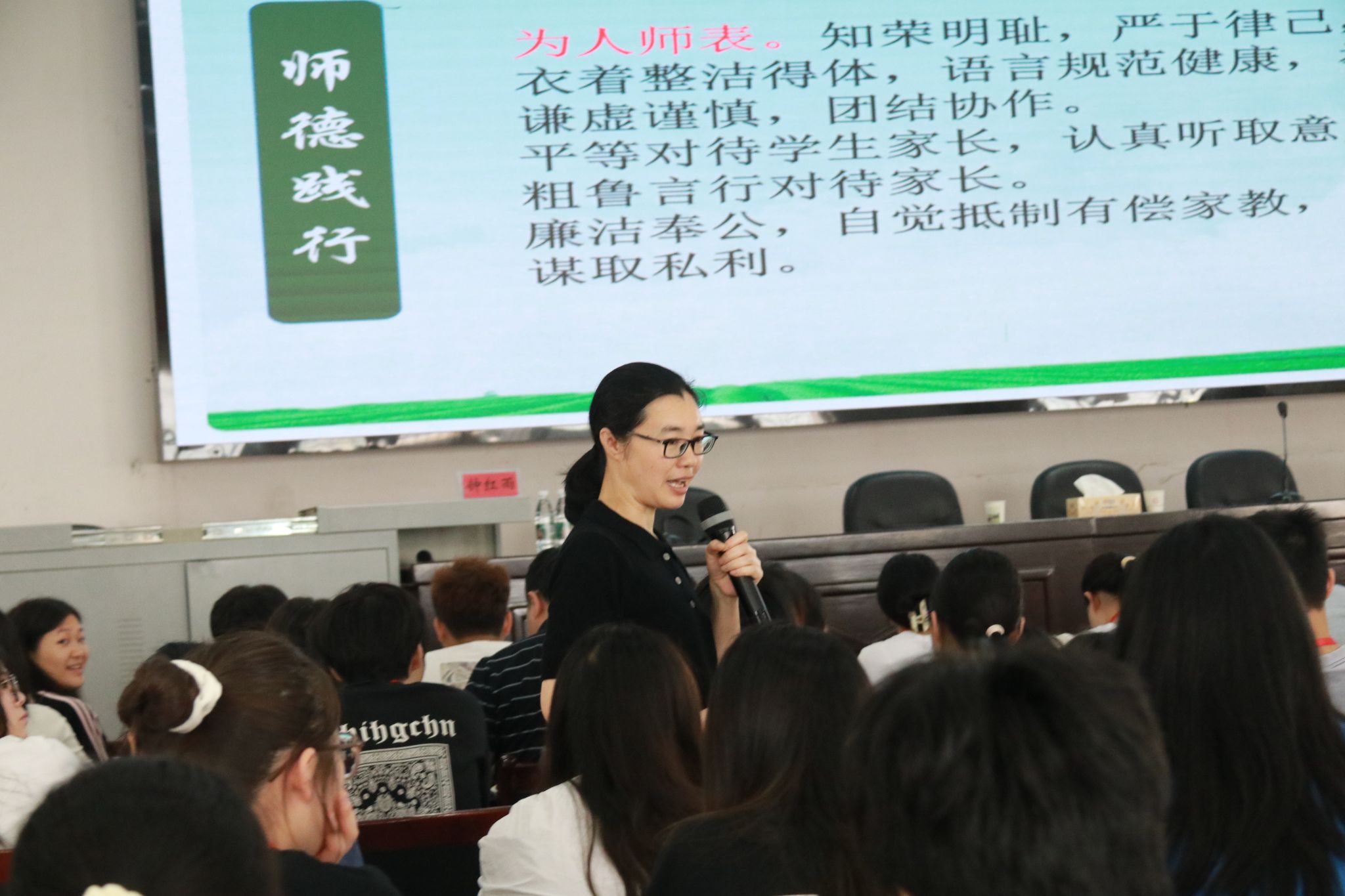 5月13日上午,该校副校长钟红雨在求真楼七楼会议室为教育见习学生作题为《践行师德规范,站稳三尺讲台》的讲座。钟红雨结合自己多年的教育教学经验和感悟,深入浅出地阐述了师德规范的内涵和要求以及作为一名教师应有的职业操守和行为准则,让在场的每一位学生都深受启发和教育。
