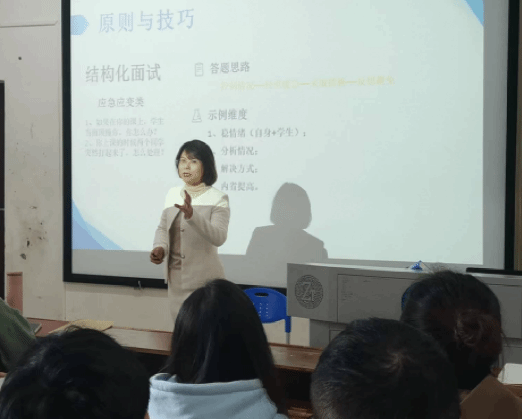 讲座由副院长罗志军主持,首先罗志军向同学们介绍了彭小玲教研员的简历和成长经历,并对讲座纪律进行了要求。从介绍中,同学们对即将开始的讲座产生了浓厚的兴趣,对彭小玲教研员的到来表示了热烈的欢迎。随后,彭小玲教研员主要就教师面试过程中遇到的常见问题及其应对技巧做了详细的讲解,特别是结构化面试的几个类别的特点以及各自的应对技巧做了透彻的剖析。期间,彭教研员以自己的亲身经历为例子现身说法,同学们犹如身临其境,茅塞顿开。