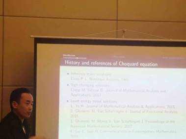 在会议分组研讨环节,郭辉作了题为“Onnodal solutions with a prescribed number of nodes for several nonlocal ellipticequation”的学术报告,该报告简述了经典的Nehari方法及其推广方法,并汇报了他近年来关于几个非局部椭圆方程具有指定节点数的节点解的存在性的一些结果及最新发展和应用。