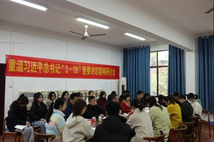 3月18日,在习近平总书记“3·18”重要讲话发表四周年之际,太阳成官网在若谷楼201召开了重温习近平总书记“3·18”重要讲话精神研讨会。学院党总支书记李伶、院长、学科带头人张卫明、副院长杨国辉、党总支副书记周友出席研讨会,学院教授代表、部分学科骨干以及特邀中小学思想政治理论课教师代表、学术研习坊全体成员参加。研讨会由学术研习坊指导老师周浩主持。