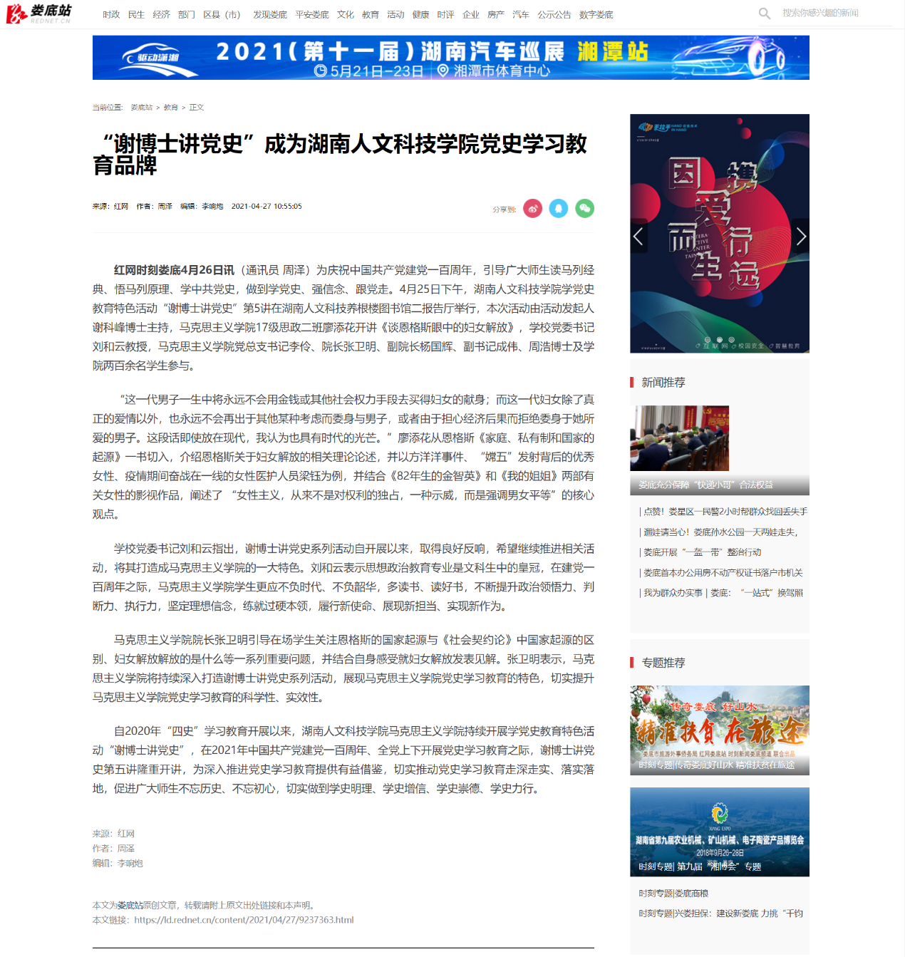 红网报道指出在建党一百周年之际和百年未有之大变局中,“谢博士讲党史”成为一条加强党史学习的有效途径,它将成为44118太阳成城集团马克思主义学院党史学习教育品牌。