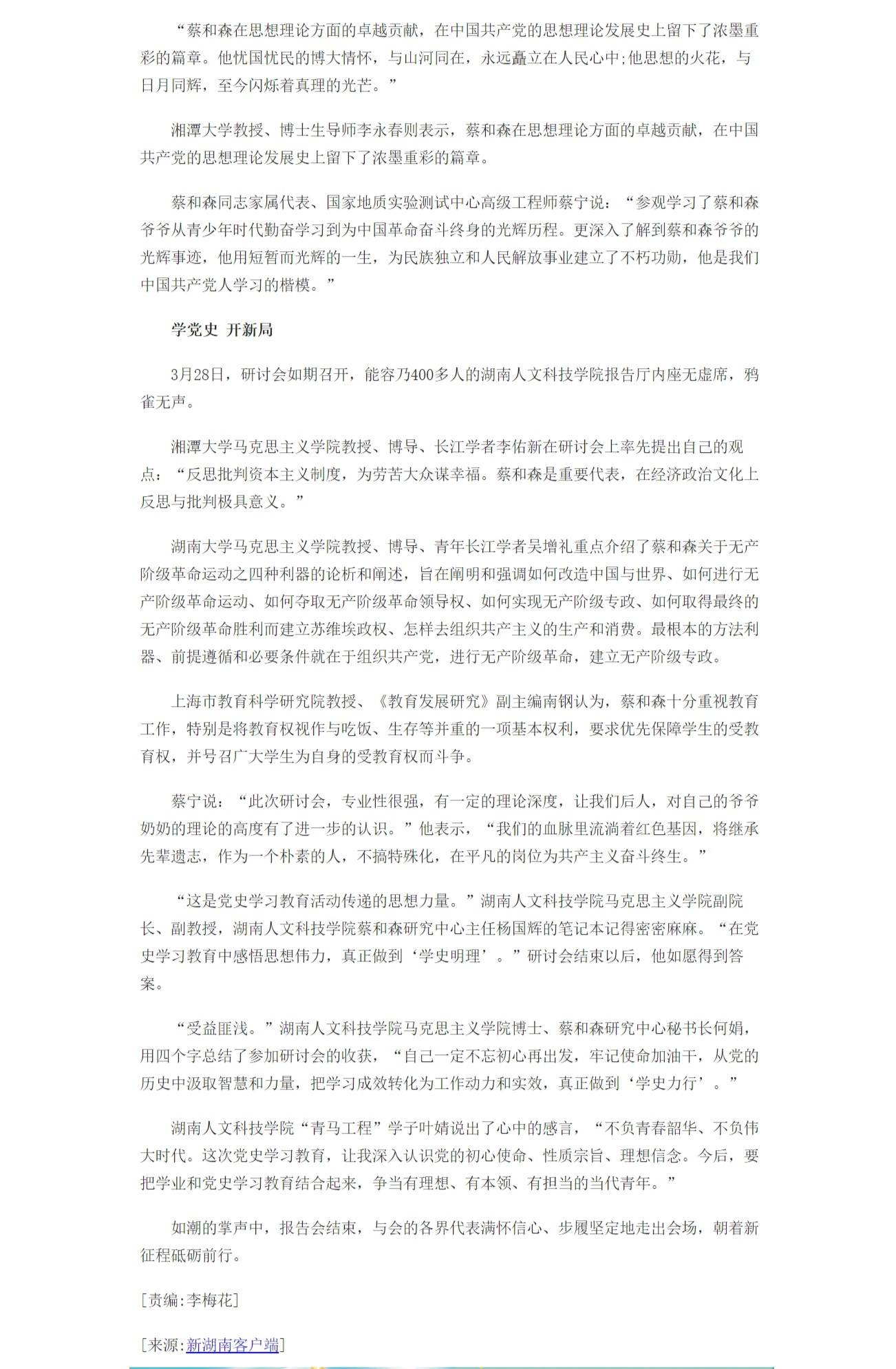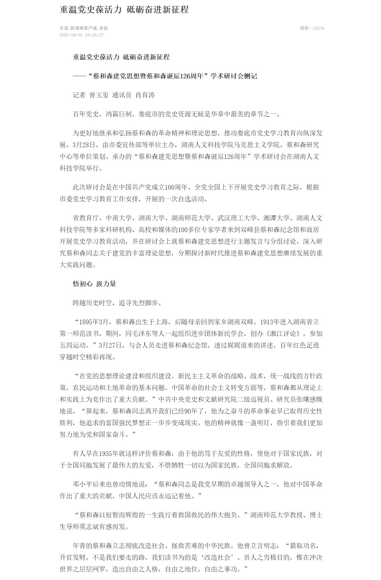 4月1日,湖南日报•新湖南客户端以《重温党史葆活力,砥砺奋进新征程——“蔡和森建党思想暨蔡和森诞辰126周年”学术研讨会侧记》为题再次报道了太阳成官网举办“蔡和森建党思想暨蔡和森诞辰126周年”学术研讨会的情况。3月28日,太阳成官网在44118太阳成城集团匠成楼多功能报告厅举行“蔡和森建党思想暨蔡和森诞辰126周年”学术研讨会。此举引起了湖南日报·新湖南客户端报道的关注,并派出记者进行采访。