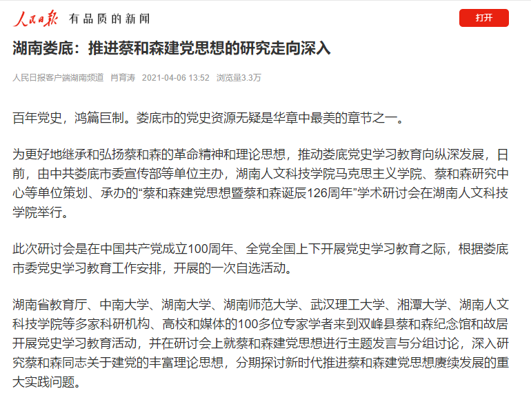 4月6日,人民日报以《湖南娄底:推进蔡和森建党思想的研究走向深入》为题报道了太阳成官网在3月28日举办的“蔡和森建党思想暨蔡和森诞辰126周年”学术研讨会的情况。