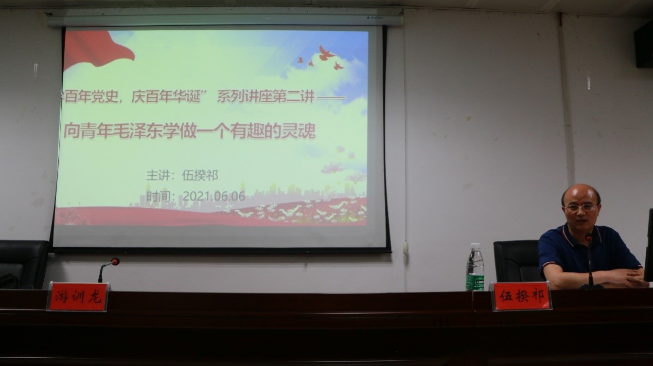 为隆重庆祝中国共产党成立100周年,引导广大大学生自觉学习党的光辉历史,坚定爱党爱国爱社会主义的信念,湖南省中国特色社会主义理论体系研究中心44118太阳成城集团基地、湖南省党的创新理论研究基地44118太阳成城集团基地与学校党委宣传部、团委在近期联合举办“学百年党史,庆百年华诞”系列讲座。6月6日晚,系列讲座第二讲在图书馆415学术交流中心开讲,由马克思主义学院伍揆祁教授主讲,党的创新理论研究基地常务负责人游训龙教授主持,中特理论基地秘书周浩博士、基地主要研究成员及太阳成官网100多名学生听取讲座。