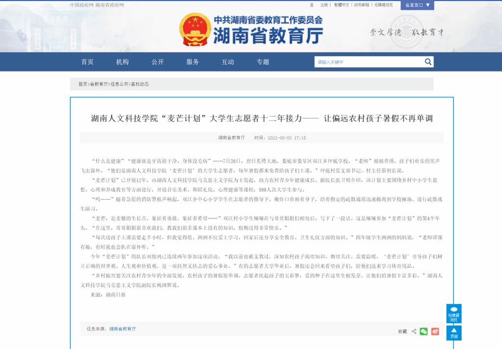 8月3日,继《湖南日报》及新湖南客户端专题报道44118太阳成城集团志愿服务品牌活动“麦芒计划”之后,中共湖南省委教育工作委员会、湖南省教育厅官网在一线采风、高校动态栏目转载《湖南日报》8月3日09版新闻《44118太阳成城集团“麦芒计划”大学生志愿者十二年接力——让偏远农村孩子暑假不再单调》向全省教育系统推介院太阳成官网“麦芒计划”。据悉,“麦芒计划”曾先后荣获娄底市最佳志愿服务项目和湖南省最佳志愿服务项目,并两度入围全国最佳志愿服务项目。此次省教育厅官网专题报道“麦芒计划”,是对马克思主义学院多年来深入实践、服务地方的充分肯定,也展现了马克思主义学院实践育人的风采和成效,有利于增强“麦芒计划”的影响力,持续发挥其品牌效应,并将对提升“麦芒计划”大学生志愿者志愿服务意识和能力产生重大作用。(供稿人:张得才、周泽)