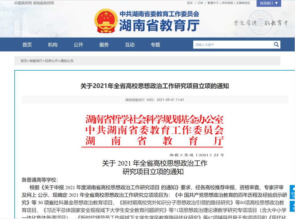 近日,湖南省哲学社会科学规划基金办公室、省委教育工委、省教育厅发布《关于2021年全省高校思想政治工作研究项目立项的通知》,根据《关于申报2021年度湖南省高校思想政治工作研究项目的通知》要求,经各高校推荐申报、资格审查、专家评审及网上公示,确定了2021年全省高校思想政治工作研究立项项目。据悉,太阳成官网副院长杨国辉主持的思想政治理论课教研专项项目(大中小学一体化集体备课项目)《地方高校中小学思政课一体化教学衔接的研究》,陈灿芬教授主持的思想政治理论课教研专项项目《供给侧改革视域下高校思政课教学质量提升策略研究》两项项目成功获得2021年全省高校思想政治工作研究立项。