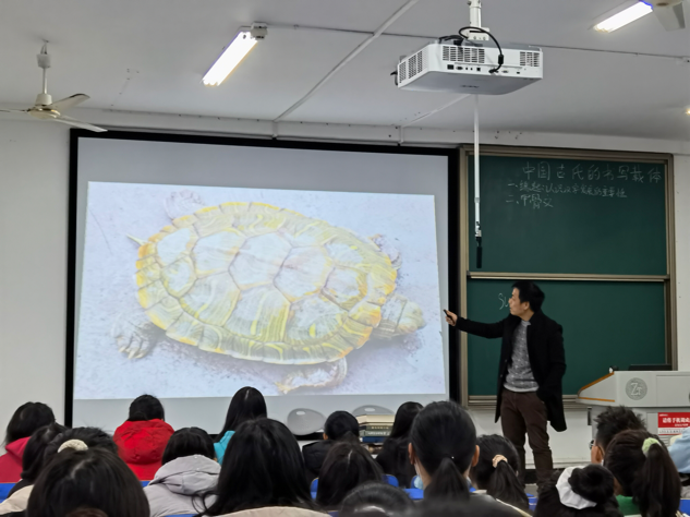 首先,谢科峰对中国文化的书写载体—文字展开介绍,详细介绍甲骨文、金文、竹简等文化载体,并结合实际与古代文化进行比较。接着,谢科峰向老师同学们讲述中国古代不同文字的背景及其主要作用。在整堂课中,他运用课件作为载体,讲授有关中国古代文化的具体知识,与学生形成良好的互动。此外,前来旁听的几位老师在课后对本堂课所存在的优点与不足与谢科峰进行了深入探讨交流。