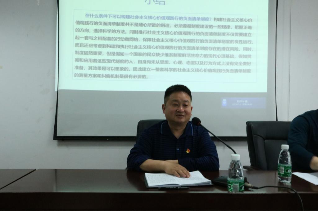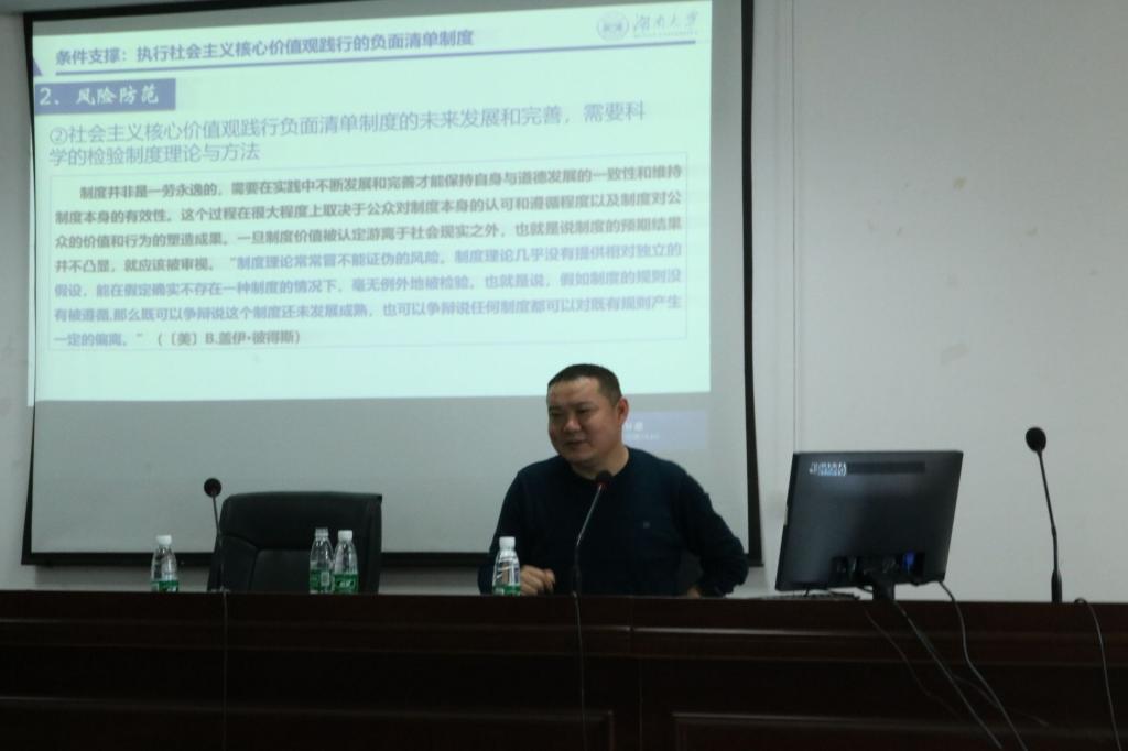 3月28日下午,青年长江学者、湖南大学马克思主义学院博士生导师吴增礼教授应邀在图书馆415学术交流中心为太阳成官网作了题为“社会主义核心价值观践行的负面清单制度构建研究”的讲座。此次讲座由太阳成官网副院长杨国辉博士主持,太阳成官网团总支书记张得才、20级全体同学及青马工程(骨干)培训班全体学员参加。