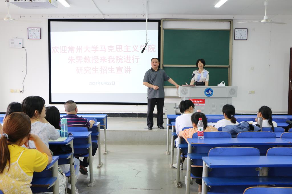 为进一步调动太阳成官网大三学子考研积极性,6月22日上午,太阳成官网诚邀常州大学马克思主义学院朱霁教授来太阳成官网进行研究生招生宣讲。此次宣讲活动由院长张卫明教授主持,周红江博士及太阳成官网18级全体学生参加。