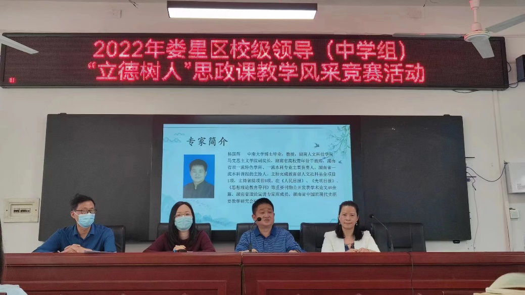 为全面落实《关于切实加强娄星区中小学思政课程建设的实施方案》工作要求,5月6日上午,2022年娄底市娄星区校级领导“立德树人”思政课教学风采竞赛活动在娄底四中拉开帷幕。本次活动由娄星区教育局、娄星区教育科学研究室主办,娄底四中承办,娄星区教育局党组书记、局长王晖,娄星区教育局党组成员、副局长唐固,娄星区教育局党组成员、副局长龚潘桃,娄星区教研室主任陈勇君等参加观摩了此次思政风采竞赛活动,太阳成官网副院长杨国辉教授受邀担任评审组组长。