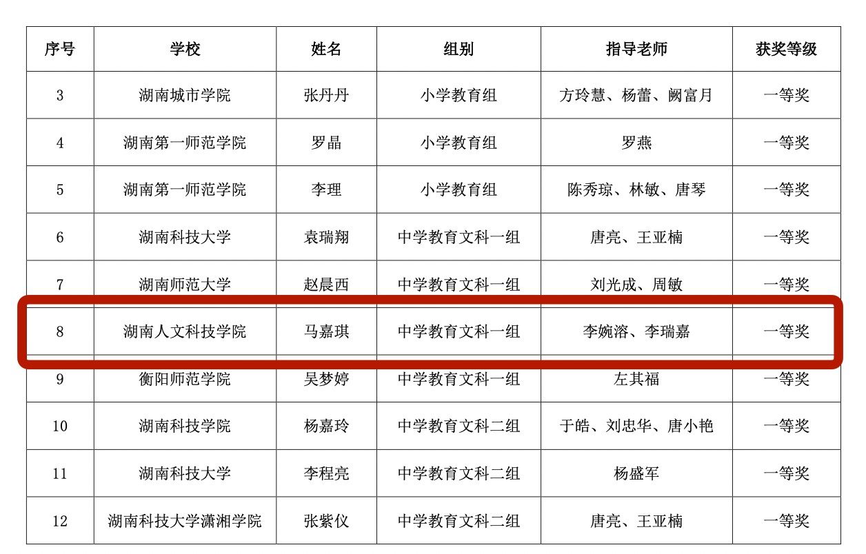 为进一步推动高等学校人才培养模式和实践教学的改革,提高师范生的教育教学能力,增强师范生的就业竞争力,11月4日,由省教育厅主办的湖南省普通高校第九届师范生教学技能竞赛在衡阳师范学院举行。由李婉溶老师、李瑞嘉博士指导的20级思政一班马嘉琪同学代表学校参赛,荣获省级一等奖。