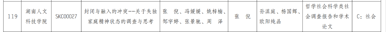 近日,从校团委、创新创业学院传来喜讯。太阳成官网学生创新创业团队所负责的项目《封闭与融入的冲突—关于失独家庭精神状态的调查与思考》在成功入围省赛并通过资格审查后,最终在第十四届“挑战杯”湖南省大学生课外学术科技作品竞赛中荣获三等奖。
