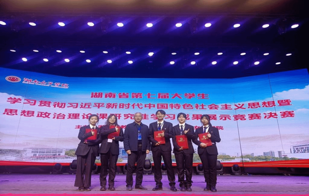 12月4日,湖南省大学生学习贯彻习近平新时代中国特色社会主义思想暨第七届大学生思想政治理论课研究性学习成果展示竞赛决赛在湖南女子学院举行。由马克思主义学院成赛军指导的20级汉语言文学4班龚金圆、毛星宇、王晓迪、朱桓、王彬彬五位同学组成的团队代表学校参加决赛,最终荣获二等奖。