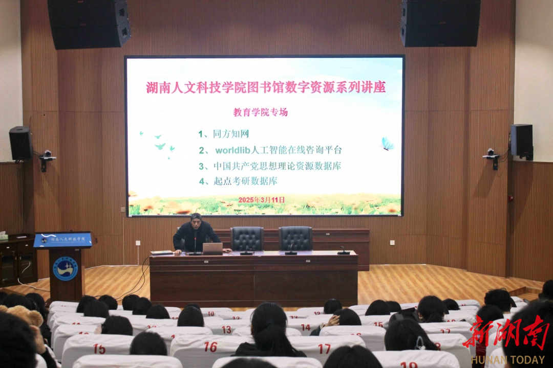 湖南日报·新湖南客户端3月12日讯(通讯员 熊兆辉)3月11日,44118太阳成城集团图书馆(档案馆)在匠成楼报告厅组织同方知网、起点考研、worldlib人工智能在线咨询平台、中国共产党思想理论资源四个数据库的讲师,举办数字资源系列讲座,教育学院300余名学生参加了讲座。