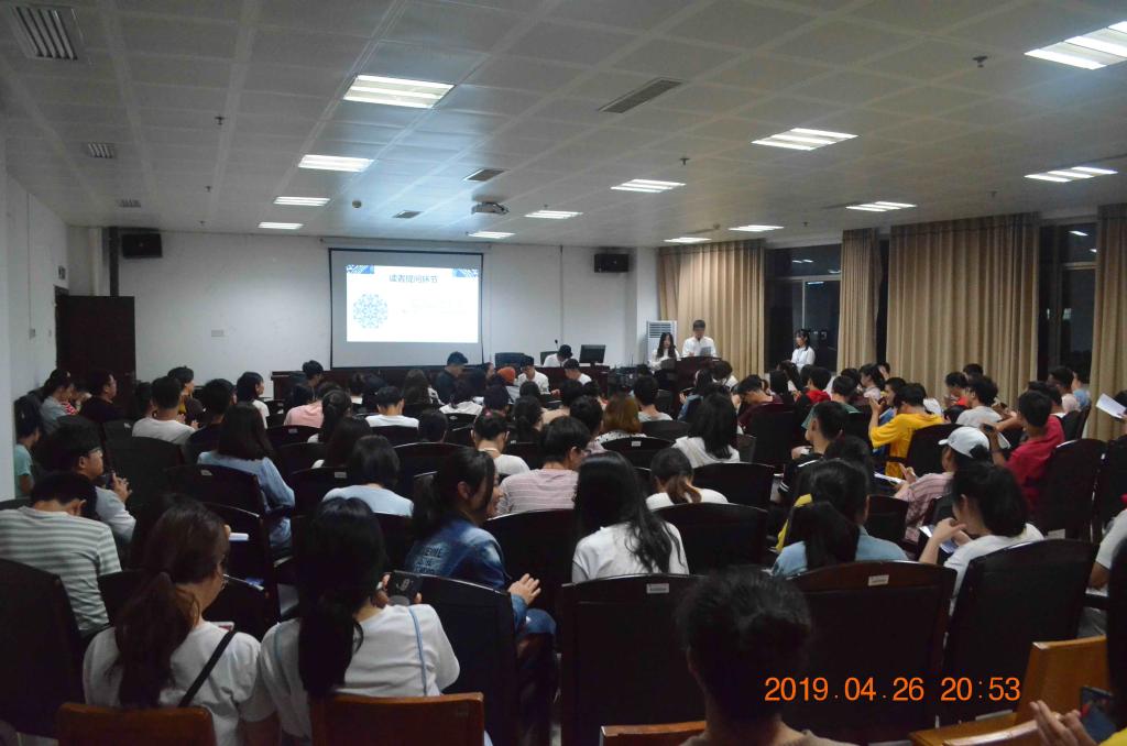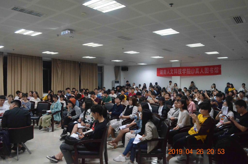 2019年4月26日晚上7:30,第26期真人图书馆活动在图书馆415学术交流中心隆重举行,2019年成功考上研究生的四位同学刘达维、毛凤余、欧阳曦和郝湘桥作为四本真人图书,与来自全校的130余位学子一起,分享了他们的考研故事。