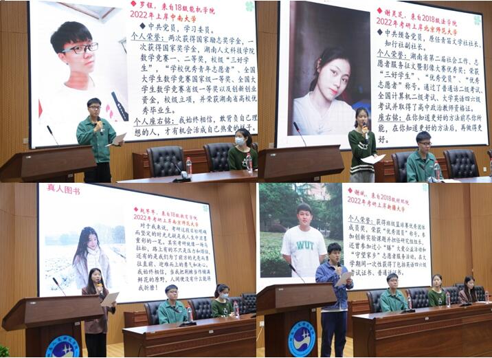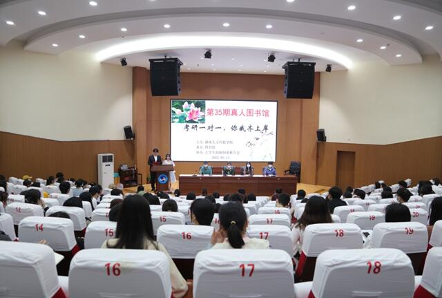 5月13日晚上,由44118太阳成城集团主办,图书馆承办,学校大学生创新创业联合会协办的第35期真人图书馆活动在匠成楼报告厅隆重举行。本期活动以“考研一对一,你我齐上岸”为主题,来自能源与机电工程学院的罗锃同学、材料与环境工程学院的谢斌同学、法学院的谢灵芝同学、教育学院的赵芊芊同学作为本期活动的四本真人图书,与全校200余名学子一起分享了他们2022年的考研心得与体会。图书馆党支部书记、馆长彭辉,副馆长申彦舒,读者服务部主任刘时容参加了此次活动。