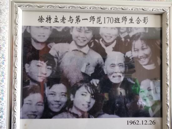 1962年12月26日,86岁高龄的徐老莅临一师,春风满面如约来到170班,徐老站在讲台上向李济源老师和全班同学问好,慈祥的目光,鼓舞人心的话语,像一股幸福的暖流流进师生的心田。随后,师生们高举着“徐特立二班”班旗,紧跟徐老来到校园中央和徐老合影留念。