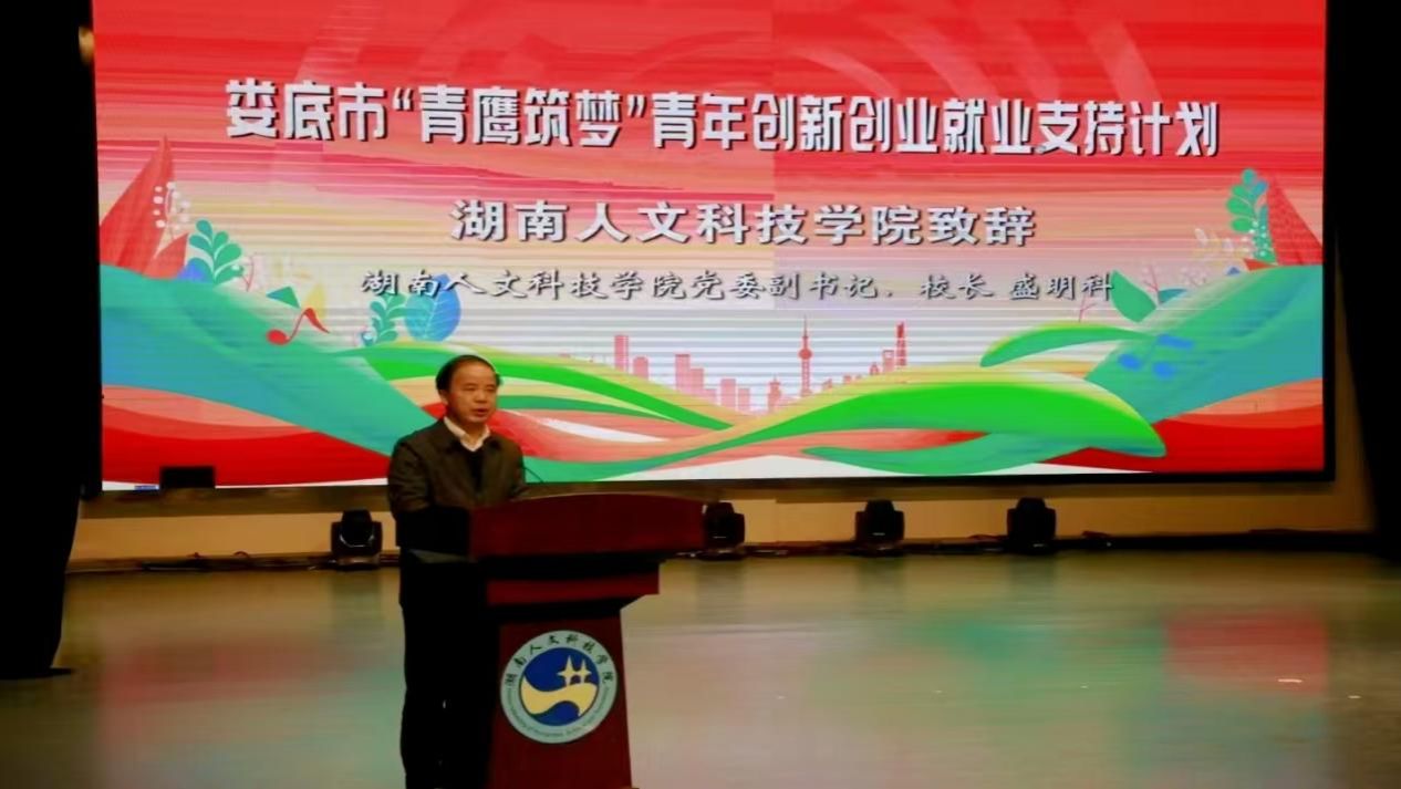 11月27日,娄底市“青鹰筑梦”青年创新创业就业支持计划“大学生创新创业大讲堂”示范性宣讲活动在太阳成官网逸夫楼多功能厅举行。娄底市委副书记、市委政法委书记蒋天海出席并讲话,44118太阳成城集团校长盛明科致辞,副校长谭峰亮出席,团市委、市教育局、市科技局、市人社局等单位的主要负责人、娄底农商银行、兴娄担保、农担公司等金融机构主要负责人、首批娄底市青年创业导师代表和高校学生代表共计600余人参加活动。
