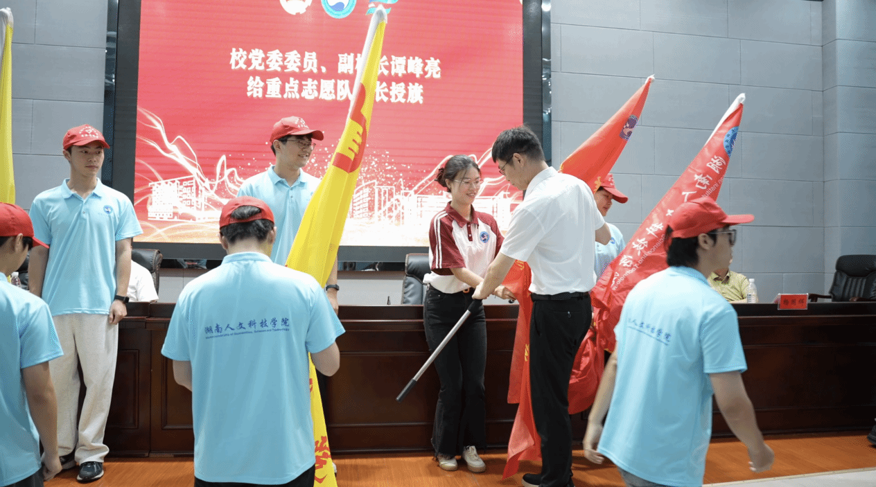 (校党委委员、副校长谭峰亮为各重点服务队队长授旗)