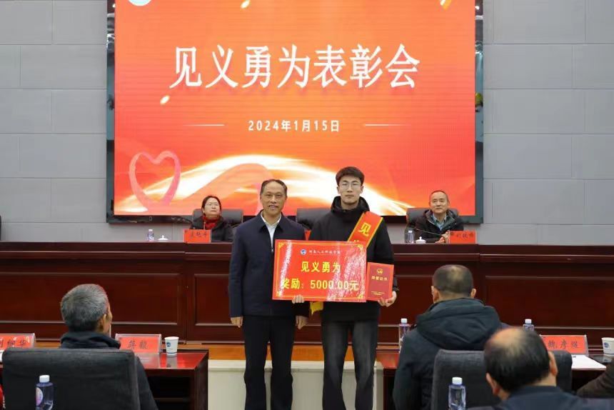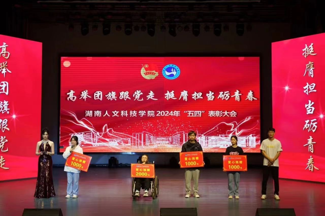 学校为了表彰周健同学见义勇为的义举,奖励了他5000元的奖金,但周健希望将奖金捐赠给有困难的同学。学校根据他的意愿,推荐了4位同学,他们是信息学院颜旭杰、体育学院谈广亮、马克思主义学院裴弈、商学院郭莹,并在“五四”表彰大会上举行捐赠仪式。