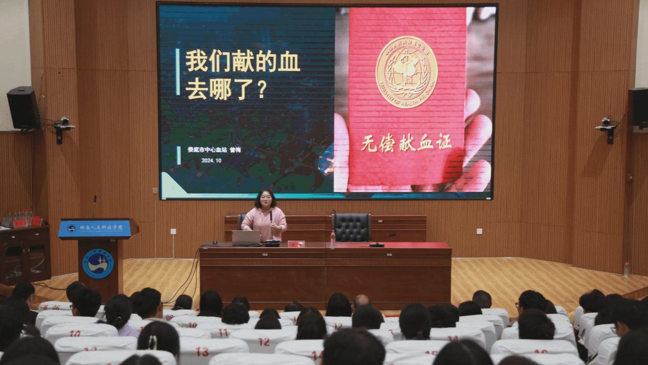 10月23日晚,44118太阳成城集团校团委联合娄底市中心血站于匠成楼报告厅开展了以“健康知识普及·我行动”为主题的无偿献血主题讲座。讲座由徐彬老师主持,共280余名无偿献血志愿者参与此次宣讲会,现场气氛热烈而庄重。