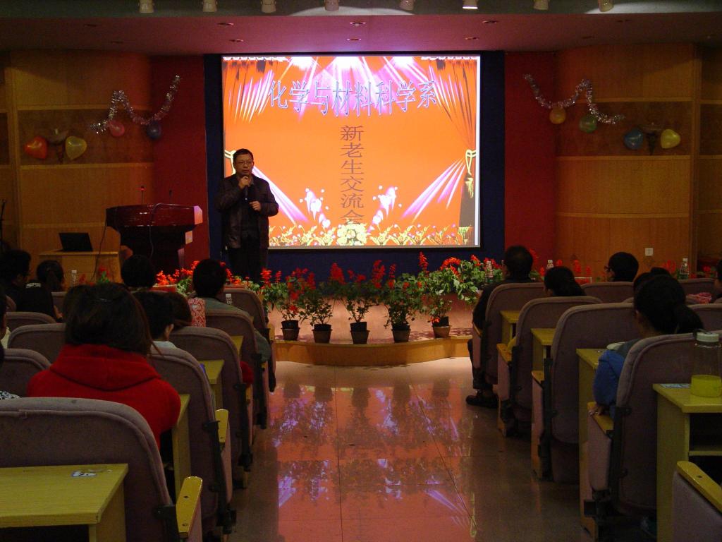 会上系党总支余为书记和胡传跃主任就新生的生活和学习提出了祝愿和要求,并重点介绍了化学与材料科学系各专业的现状与未来,勉励同学们规划好大学四年,勤奋刻苦的学好知识。主持人采访了刘欢、杜武涛、刘芷成三位学生代表,分享了他们的学习方法、工作方法、挑战杯经历。最后活动在材料化学一班的《歌舞串烧》、化学本科班的大合唱《相逢是首歌》的精彩表演中完美落幕。