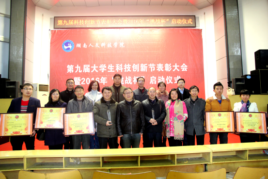 12月22日晚,由校团委举办的第九届大学生科技创新节表彰大会暨2016年挑战杯启动仪式在匠成楼报告厅隆重举行。校长刘和云、副校长蒋建初、副校长石潇纯、纪委书记李凤莲,副校长陈志国、校长助理谢贵辉、教务处、科研处、团委、学工处、研究生处和各系部相关负责人及参赛师生参加了大会。会议由李凤莲书记主持。