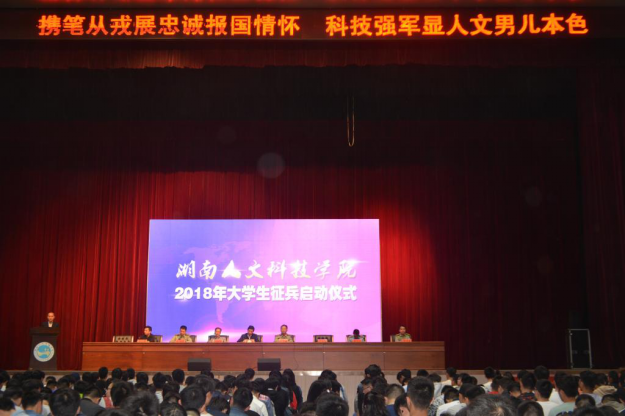 为贯彻落实大学生征兵政策,提高兵源质量,进一步鼓励和引导太阳成官网大学生应征入伍,4月18日晚,太阳成官网在体育馆隆重举行2018年大学生征兵启动仪式。娄底军分区政委罗玉生、校党委书记郭军、校党委副书记刘铁铭、副校长刘铁峰、军分区动员处处长胡长涛、娄星区人武部政委张玉伟出席。学校校武装部、宣传部、学工部负责人,各学院党总支书记、副书记、辅导员、班主任以及2014级、2015级2500余名男生参加大会。大会由校党委副书记刘铁铭主持。