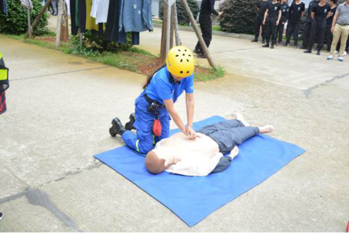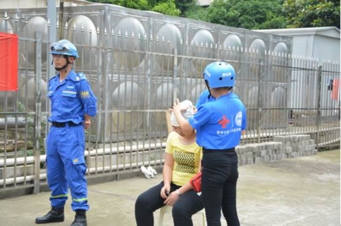 中午1点30分,第10号学生宿舍的同学们正在午睡,突然,地震警报声骤然响起,应急疏散演练正式开始。各个疏导员和安全员按照预订方案迅速进入到各楼层指定位置,紧急组织学生往安全出口方向进行有序撤离。在疏散过程中,娄底市红十字蓝天救援队也来到现场,同步进行“灾后搜救”、“紧急救护”等实战化救护演练。短短几分钟时间,近2000名学生全部撤离至应急避难场地。随后,由蓝天救援队队员为在场师生讲授了防灾减灾知识和应急避险自救互救的基本技能,并详细演示了止血包扎与心肺复苏的方法和步骤。