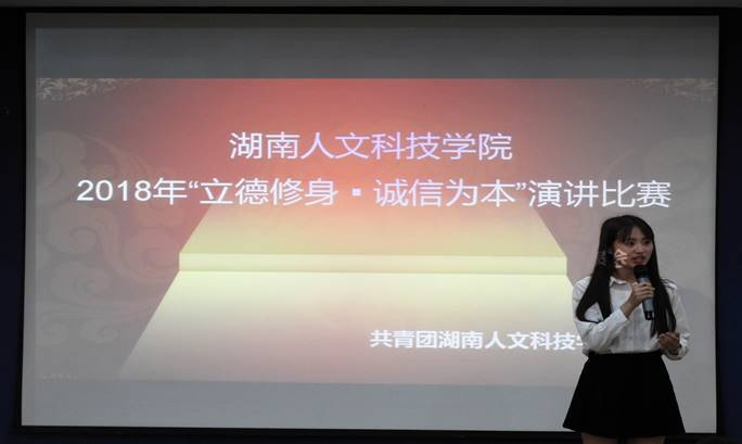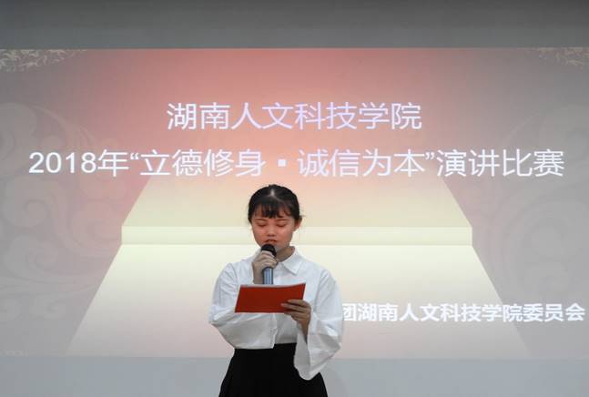 5月18日下午,校团委主办的 “立德修身,诚信为本”演讲比赛在养根楼顺利举办。校团委副书记魏彦煜、刘晔,校团委专干老师刘佳,外国语学院团总支书记曹瑜虹以及娄底综合广播电台主播崔凯博担任决赛评委。