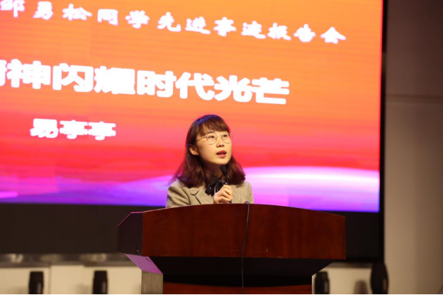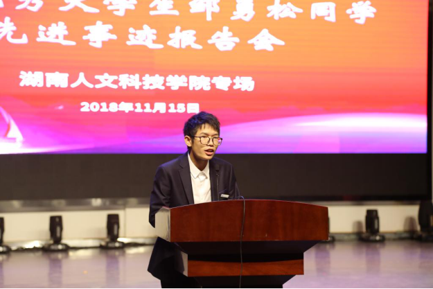 邹勇松先进事迹宣讲团成员李凝玉、王浩杨、易亭亭先后从不同角度讲述了邹勇松的优秀事迹。李凝玉从同窗好友的角度回顾了和邹勇松一起在新化一中的求学历程,细致的讲述了邹勇松虽出身寒门,身患尿毒症,却学习异常刻苦,经常到福利院献爱心的感人事迹。王浩杨从学长的角度追忆了和邹勇松的科研创新之路,与大家分享了邹勇松在与病魔作斗争的同时,不仅获得了研究生数模建赛省级二等奖、国家级三等奖及国家奖学金,还获得了“一种紧急救助处理办法”、智能机器人的导航方法和导航系统等多项发明专利。易亭亭则从教师角度深情讲述了病中的邹勇松顽强拼搏、帮助他人的故事。易老师说,邹勇松身上所传递出来的“向阳”精神让她深受鼓舞和灵魂触动。她倡议广大青年学生,要立鸿鹄志,做奋斗者,让所有的苦难与不幸都绽放光芒。