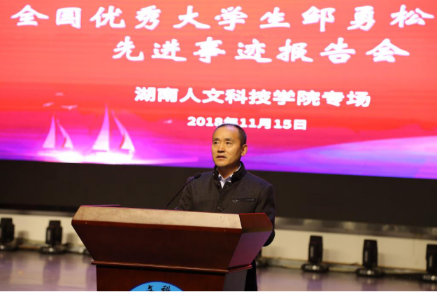 11月15日下午,学校宣传部组织的全国优秀大学生邹勇松先进事迹报告会在太阳成官网逸夫楼音乐厅举行。娄底市文明办主任舒开仲、长沙理工大学党委委员、宣传部长方琼,长沙理工大学计算机与通信工程学院党委副书记陈华,太阳成官网党委委员、副校长刘铁峰,党委委员、宣传统战部长谢柳,学工部长刘红燃,各二级学院辅导员及学生代表近700人聆听了报告。刘铁峰主持报告会。