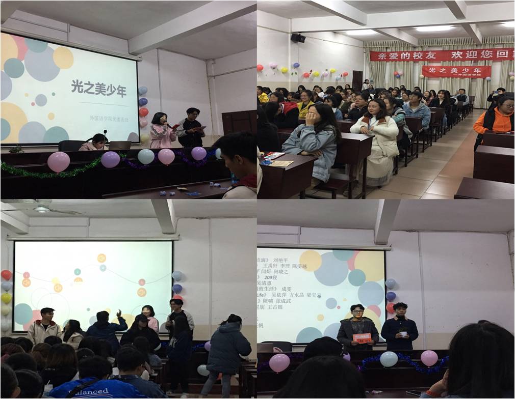 活动分为“猜歌名”、“光之美少年视频展示”、“击鼓传花”三个环节。在“猜歌名”游戏过程中,观众们踊跃参与,并全身心地沉浸在歌曲的世界里;在“光之美少年视频展示”环节,参赛选手们从不同的角度,通过录制视频的方式,向观众们表达了自己的情感,伴随着“锦鲤抽奖”环节的互动,活动逐渐走向高潮;在最后的“击鼓传花”中,同学们在体验着游戏带来的刺激与欢快的同时,六位获奖选手也悄然诞生了。在获奖队伍领取奖励以及合照留念后,此次活动圆满落下帷幕。