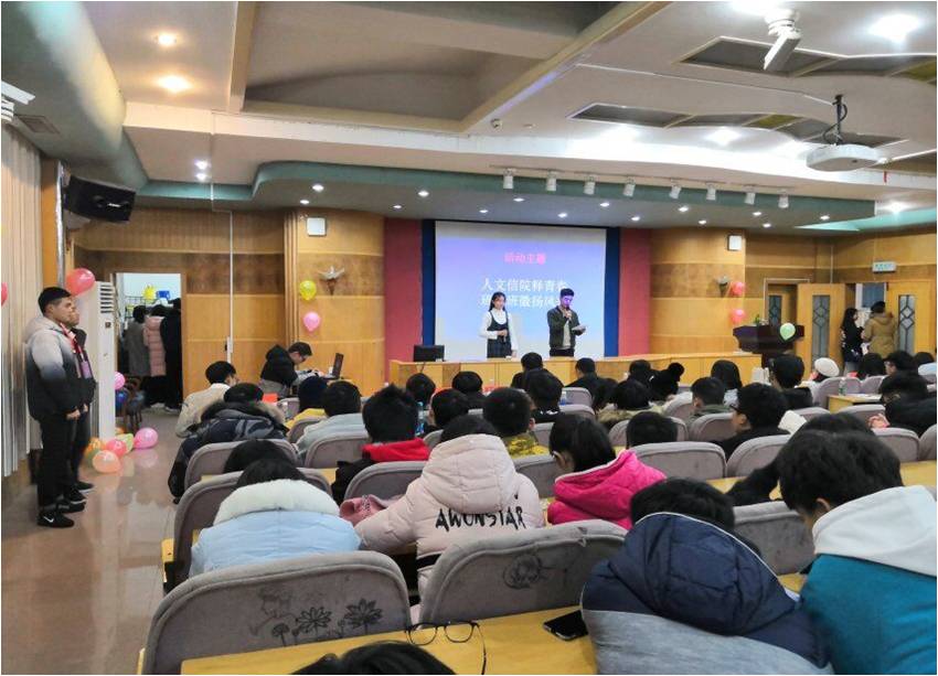 12月9日上午,来自信息学院各个班的学子在养根楼报告厅参加了“人文信院释青春,班服班徽扬风采”特色活动。