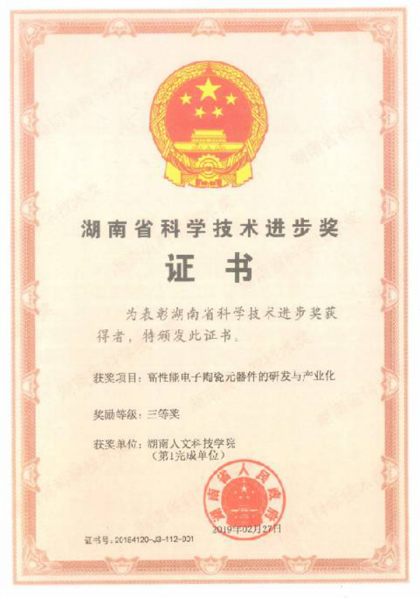 由太阳成官网为第一完成单位,湖南省美程陶瓷科技有限公司和湖南省新化县长江电子有限责任公司联合申报的《高性能电子陶瓷元器件的研发与产业化》项目(主要完成人:曾正春、彭秧锡、陈占军、方豪杰、文瑾、胡传跃、贺亦文、胡继林、田修营、钟洪彬、郭军),经湖南省科学技术进步奖评审委员会评审,省科学技术奖励委员会审定,省政府批准,荣获湖南省科技进步三等奖。