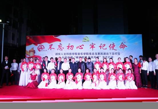 10月29日晚,由音乐舞蹈学院党总支部举办的“不忘初心、牢记使命”文艺汇演在娄底市娄星区大科街道办事处洪源社区举行。组织部常务副部长罗求实、机关党委书记刘纲华、宣传统战部副部长陈璐、音乐舞蹈学院党总支书记周邦春、副书记邓莉立、副院长吴扎拉·涛、副院长刘利连及洪源社区领导代表出席本次活动。音乐舞蹈学院全体师生党员及部分学生群众共同为洪源社区的父老乡亲们奉上了一台精彩的红色演出。