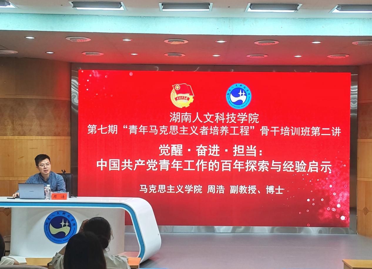 5月15日晚,马克思主义学院周浩博士于养根楼报告厅为第七期“青马工程”骨干培训班全体学员开展题为“觉醒·奋进·担当:中国共产党青年工作的百年探索与经验启示”的主题讲座。讲座由班主任李婉溶主持,第七期青年马克思主义者骨干培训班全体学员参加。