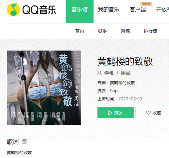 “有一种挺进叫逆行,为了武汉的焦虑和哭声,放下除夕团圆的酒盅,在请战书上写下自己的姓名……”歌曲《黄鹤楼的致敬》正式上线,被网友争相传唱。