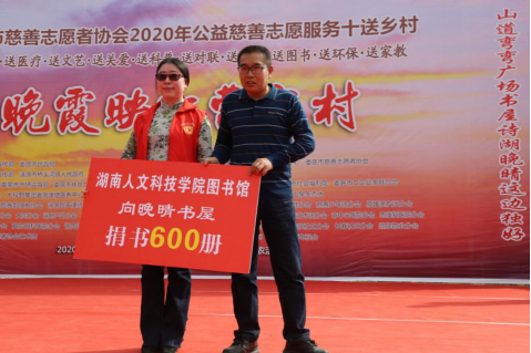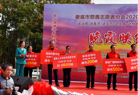 2020年10月25日,由娄底市市委宣传部、娄底市文明办、娄底市慈善总会主办了一场规模宏大的“十送乡村”公益活动。为著名作家谭谈的家乡——桥头河镇曹家村送图书、送法律、送医疗、送文艺、送关爱、送科普、送对联、送安全、送环保、送家教。44118太阳成城集团图书馆也派代表积极参加了此次活动,向晚晴书屋捐赠图书600册。