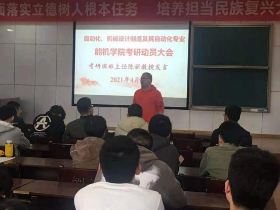 能源与机电工程学院坚持党建引领,构建了具有工科特色的“三全育人”体系,牢固树立了一切为了学生、为了学生一切、为了一切学生的教育理念。为更好地调动学生考研积极性,帮助学生确立考研目标,增强学生考研信心,坚定学生考研决心。4月9日下午,学院在同德楼601教室分专业召开了2018级学生考研动员大会,院党总支书记彭辉、院党总支副书记伍铁斌教授、考研班班主任陈新教授、院学工办主任邓景文老师、2018级考研学生共196人和2017级考取研究生的学生代表参加大会。