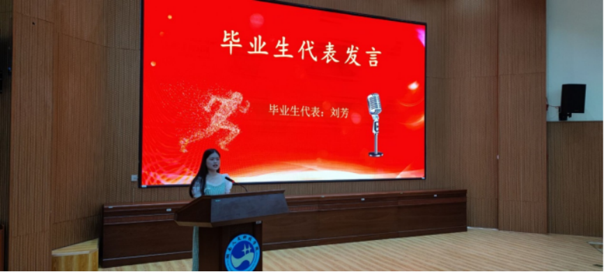 刘芳作为优秀毕业生代表发言。她分享了自己在大学四年的成长经历,表达了自己对老师栽培的感谢和对同学情谊的珍惜,并倡导同学们努力付诸实践行动,成就精彩人生。