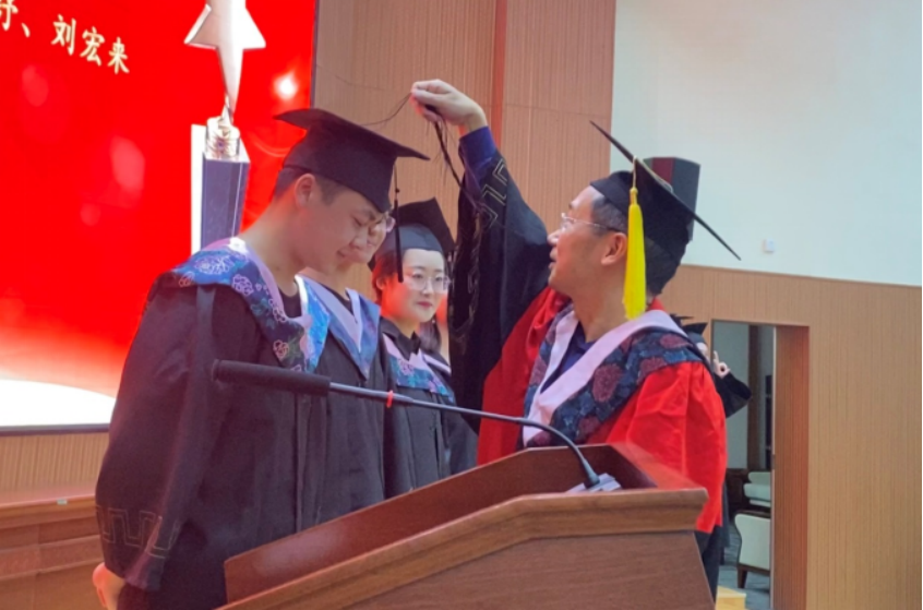 倪正芳诗意地将经典名著与人生哲理结合,他寄语毕业生们:“看破红与黑,不做变色龙,警惕名利场,不做局外人,拼搏一千零一夜,终将走向伟大前程”。倪院长祝愿同学们在未来的道路中,能够专注每一步,走好每一步。随后,倪院长为毕业生代表拨穗。