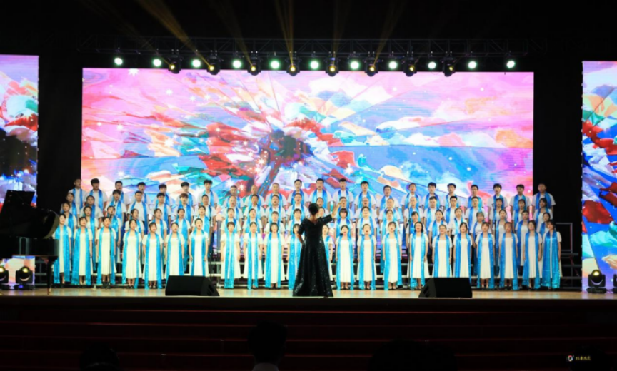 (图为校长刘铁铭宣布总结表彰大会礼成、师生合唱比赛开始)