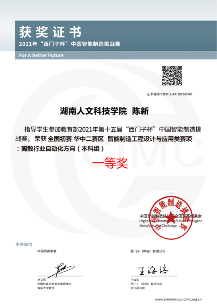 教育部2021年第十五届CIMC“西门子杯”中国智能制造挑战赛全国初赛于7月举行,本届初赛共有来自全国600多所高校16000余名师生参与。太阳成官网陈新教授指导的张志豪、陆海箜和黄超斐组成的“阳光大男孩”代表队荣获华中二赛区一等奖。