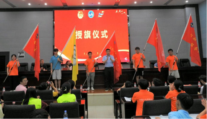 仪式上,副校长曹鑫希望参与活动师生做到与专业学习相结合,与地方特色相结合,与创新创业相结合;以安全、有序、务实的方式精心组织;加强宣传,做好提炼进行精心总结。希望师生向书本求教,向实践求教,向人民求教,积极认真的投入社会实践活动中去。随后,曹鑫副校长为5支重点志愿服务队授旗。启动仪式在慷慨激昂的共青团团歌声中落下帷幕。参与启动仪式师生在图书馆合影留念后。