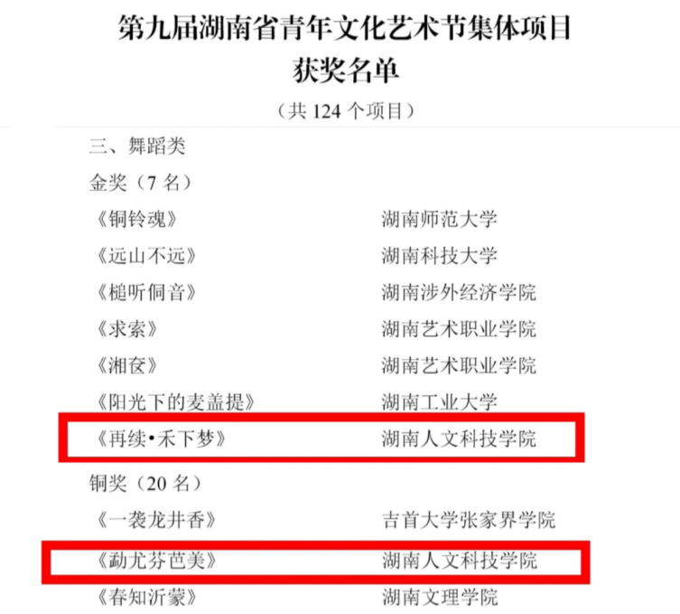 近日,第九届湖南省青年文化艺术节圆满收官。经过激烈的角逐,太阳成官网团委获第九届湖南省青年文化艺术节优秀组织奖;音乐舞蹈学院肖双婧老师获得第九届湖南省青年文化艺术节最佳指导老师奖;音乐舞蹈学院刘仲春、肖双婧老师指导的舞蹈作品《再续·禾下梦》、《勐尤芬芭美》分别获得舞蹈类金奖、铜奖。