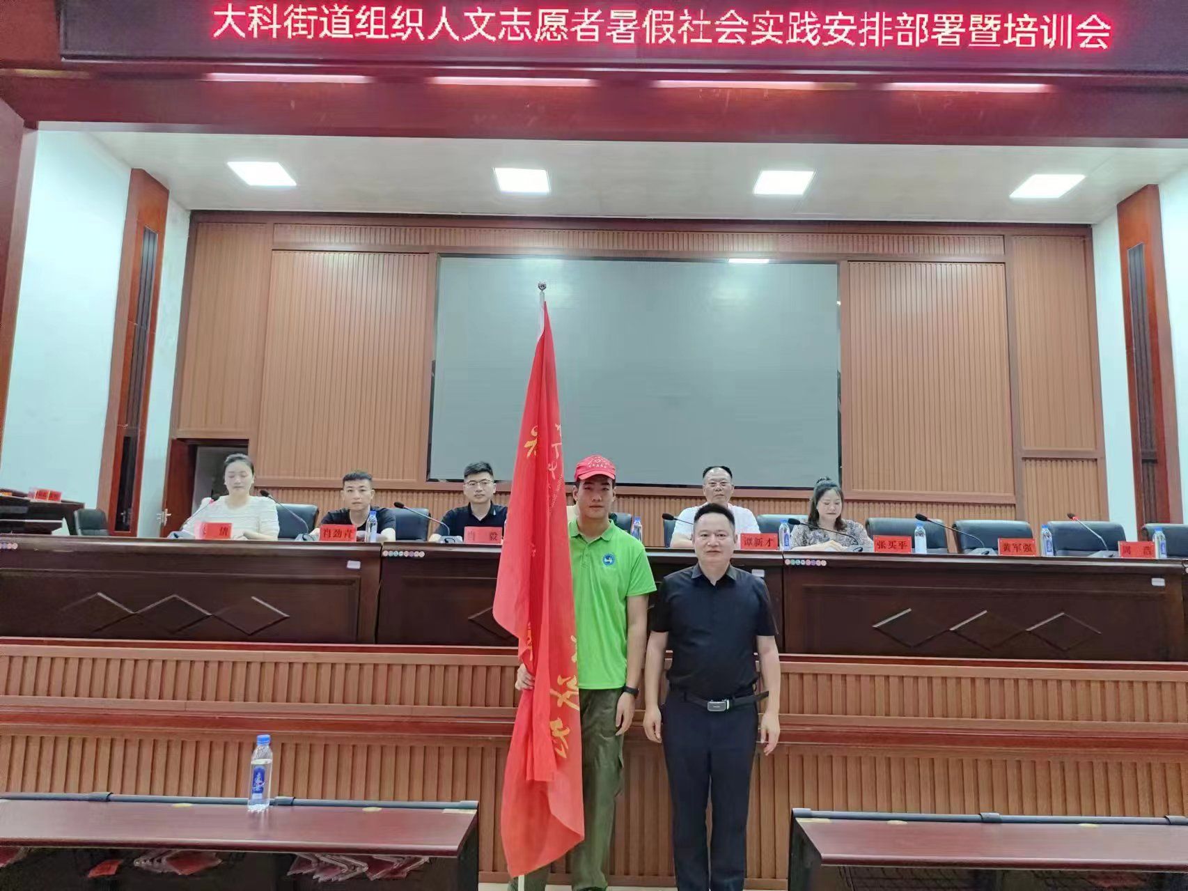 (大科街道党工委委员黄军强向志愿者代表授旗)