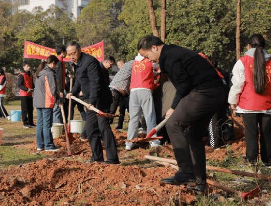 植树现场,校领导们和志愿者们或两人一组,或三人一队,扶树正苗、培土围堰、浇水定根,气氛热烈。每个环节衔接有序,配合默契,植树现场一片繁忙有序、干劲十足的景象。历经1小时的辛勤劳作,一株株金丝楠木、桃树错落有致,迎风挺立,焕发出无限生机与活力。