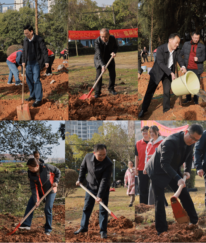 (校领导们与志愿者一起挥锹铲土,浇水定根)